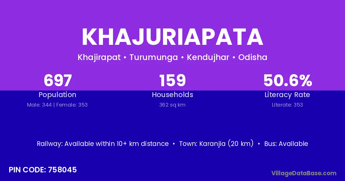 Karanjia (20 km) is the nearest town to Khajuriapata village for major economic activities and is located approximately 20 km away.