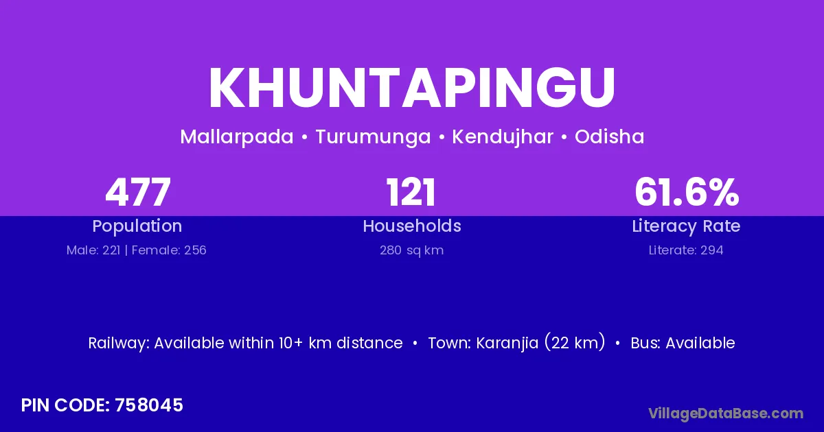 Karanjia (22 km) is the nearest town to Khuntapingu village for major economic activities and is located approximately 22 km away.