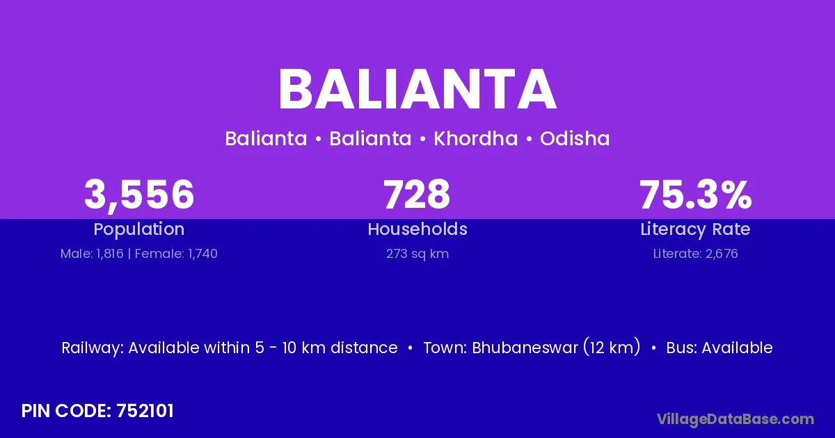 Bhubaneswar (12 km) is the nearest town to Balianta village for major economic activities and is located approximately 12 km away.