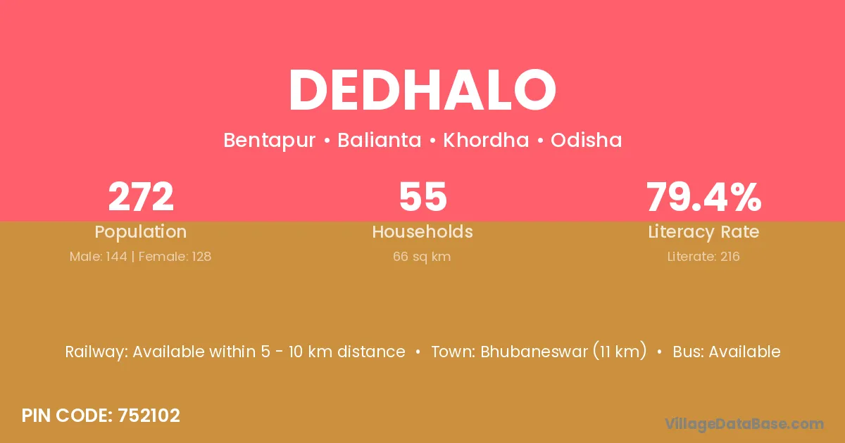 Bhubaneswar (11 km) is the nearest town to Dedhalo village for major economic activities and is located approximately 11 km away.
