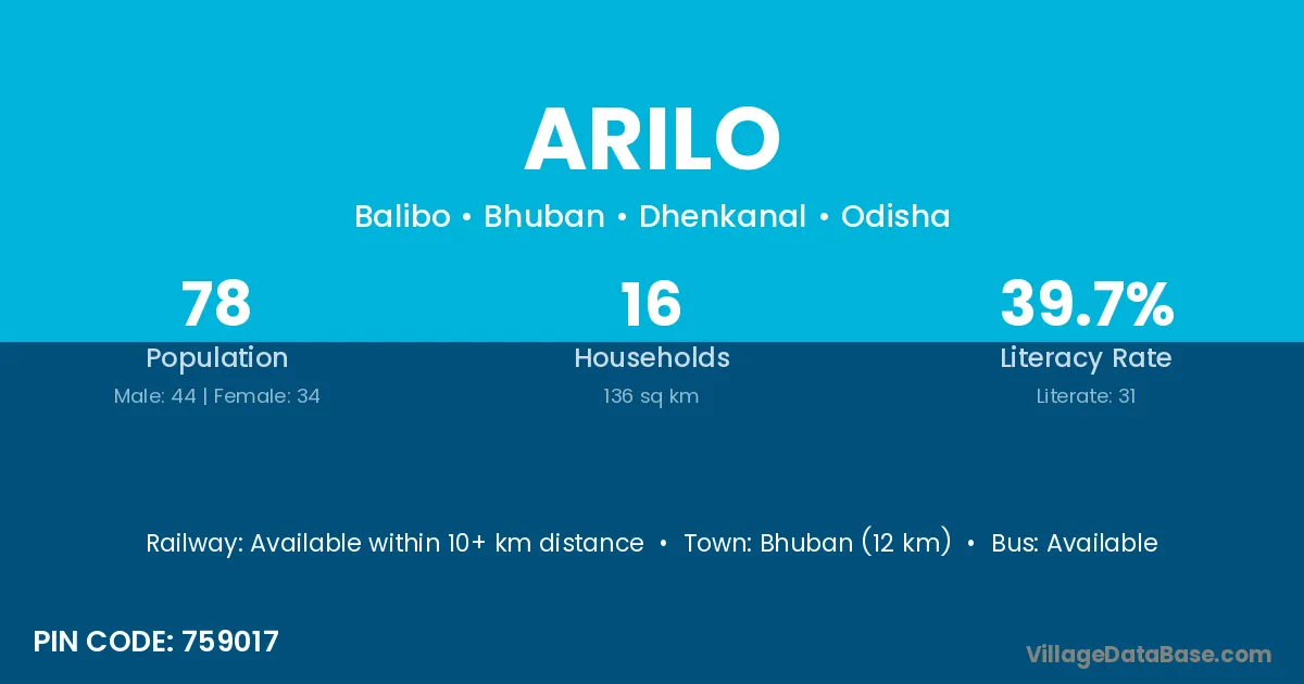 Bhubaneswar (38 km) is the nearest town to Arilo village for major economic activities and is located approximately 38 km away.