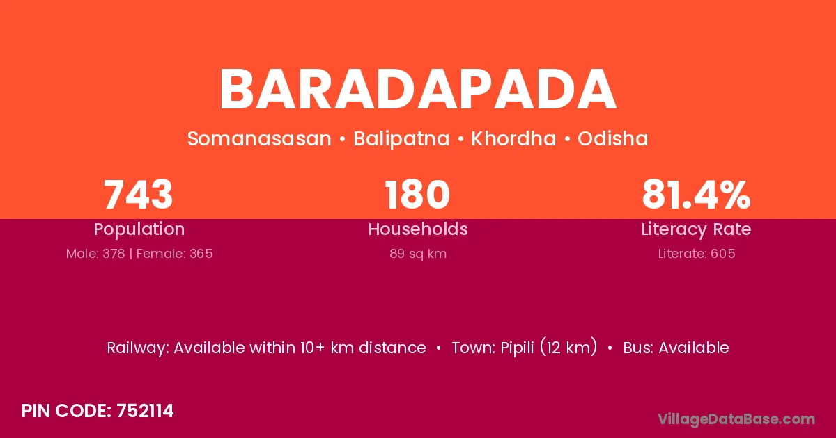 Pipili (12 km) is the nearest town to Baradapada village for major economic activities and is located approximately 12 km away.