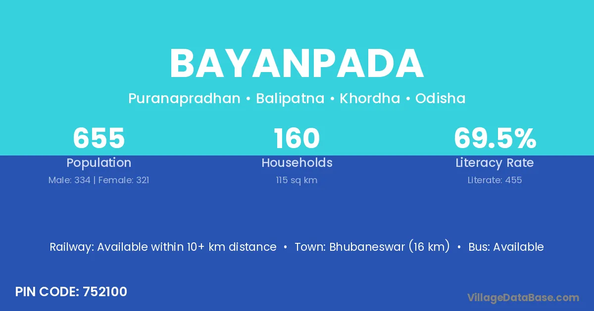 Bhubaneswar (16 km) is the nearest town to Bayanpada village for major economic activities and is located approximately 16 km away.