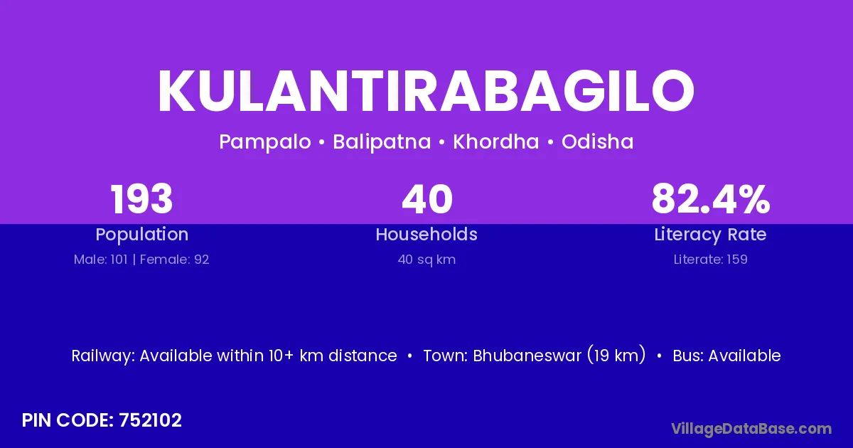 Bhubaneswar (19 km) is the nearest town to Kulantirabagilo village for major economic activities and is located approximately 19 km away.