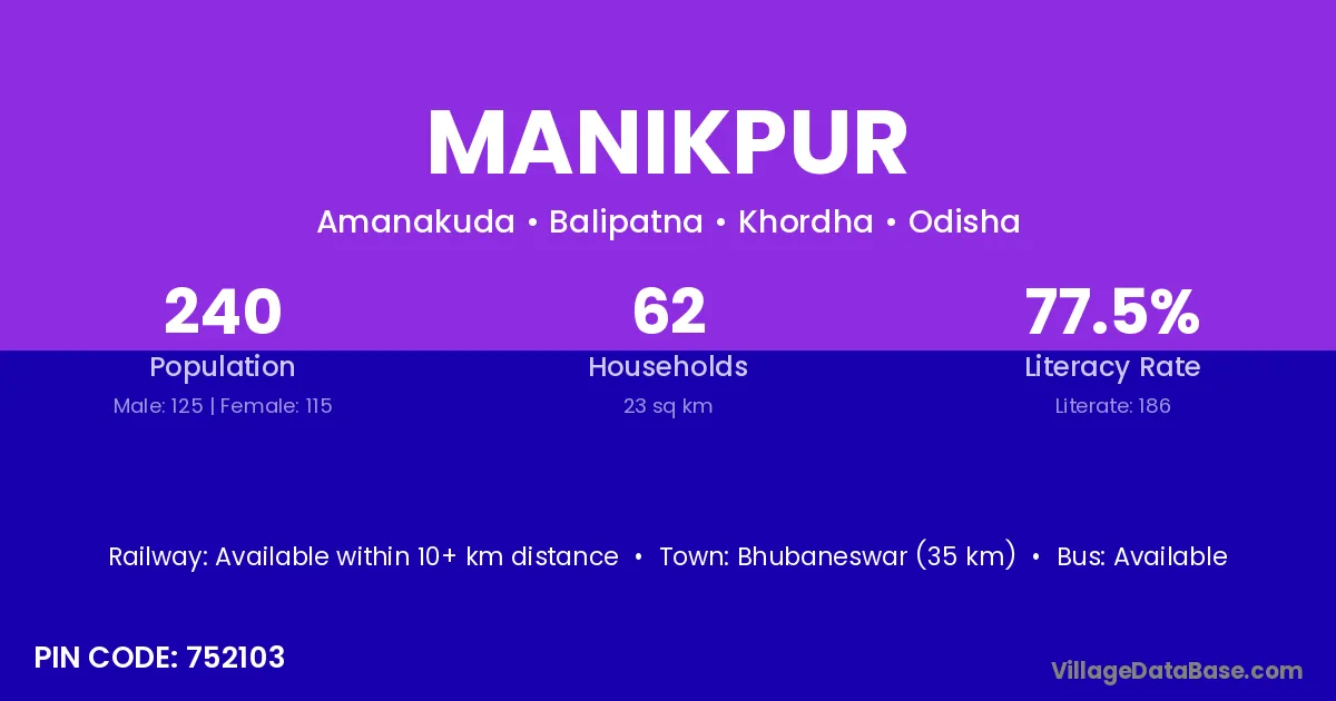 Bhubaneswar (35 km) is the nearest town to Manikpur village for major economic activities and is located approximately 35 km away.