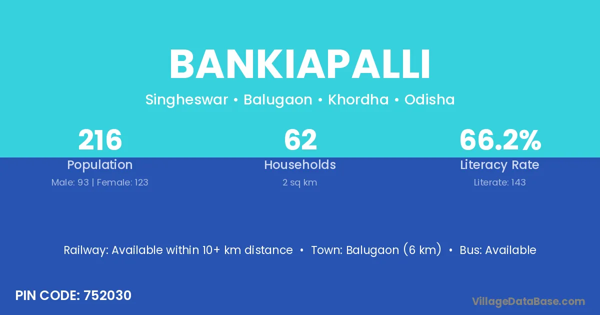 Balugaon (6 km) is the nearest town to Bankiapalli village for major economic activities and is located approximately 6 km away.