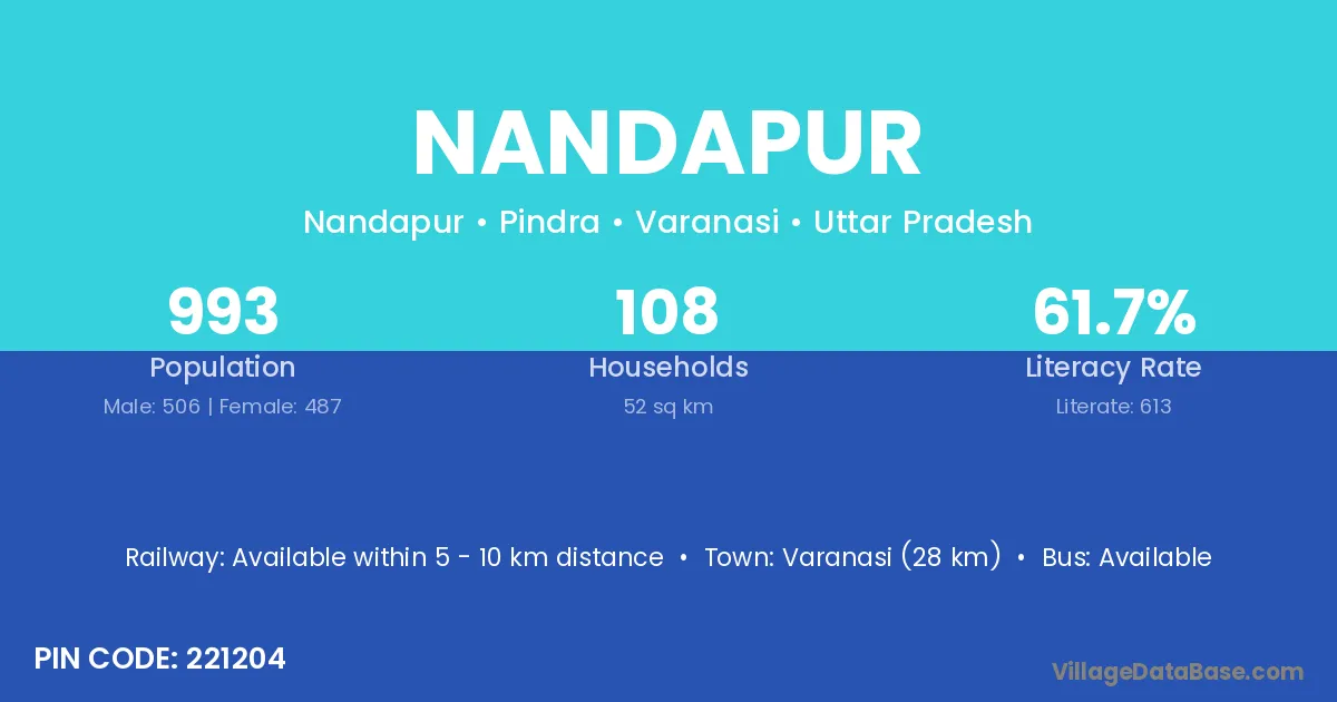 Nandapur village has a total population of 2,015 people, of which 1,028 are males and 987 are females.
