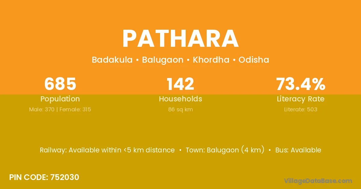 Balugaon (4 km) is the nearest town to Pathara village for major economic activities and is located approximately 4 km away.