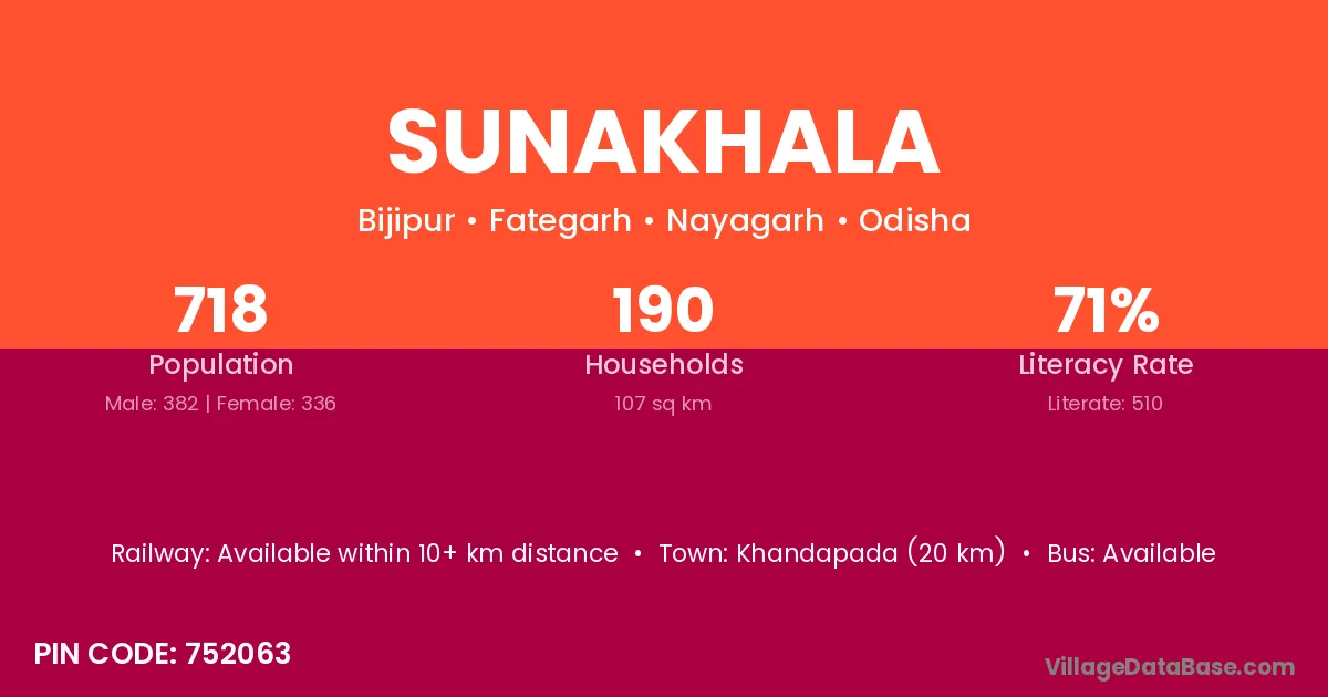 Balugaon (15 km) is the nearest town to Sunakhala village for major economic activities and is located approximately 15 km away.