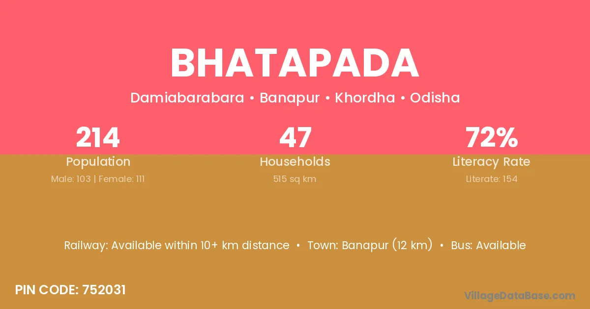 Bhatapada village has a total population of 214 people, of which 103 are males and 111 are females.