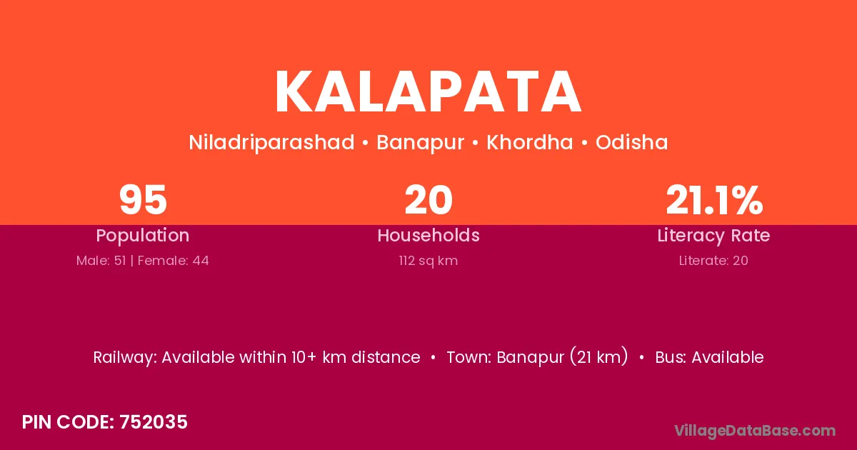 Banapur (21 km) is the nearest town to Kalapata village for major economic activities and is located approximately 21 km away.