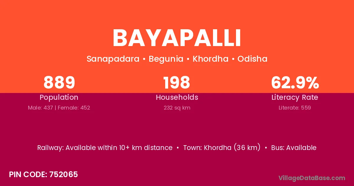 Bayapalli village has a total population of 889 people, of which 437 are males and 452 are females.