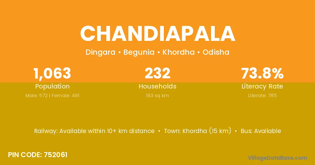 Khordha (15 km) is the nearest town to Chandiapala village for major economic activities and is located approximately 15 km away.