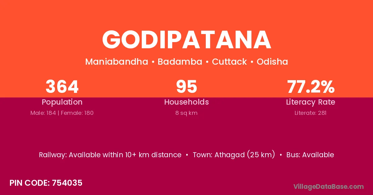 Khordha (26 km) is the nearest town to Godipatana village for major economic activities and is located approximately 26 km away.