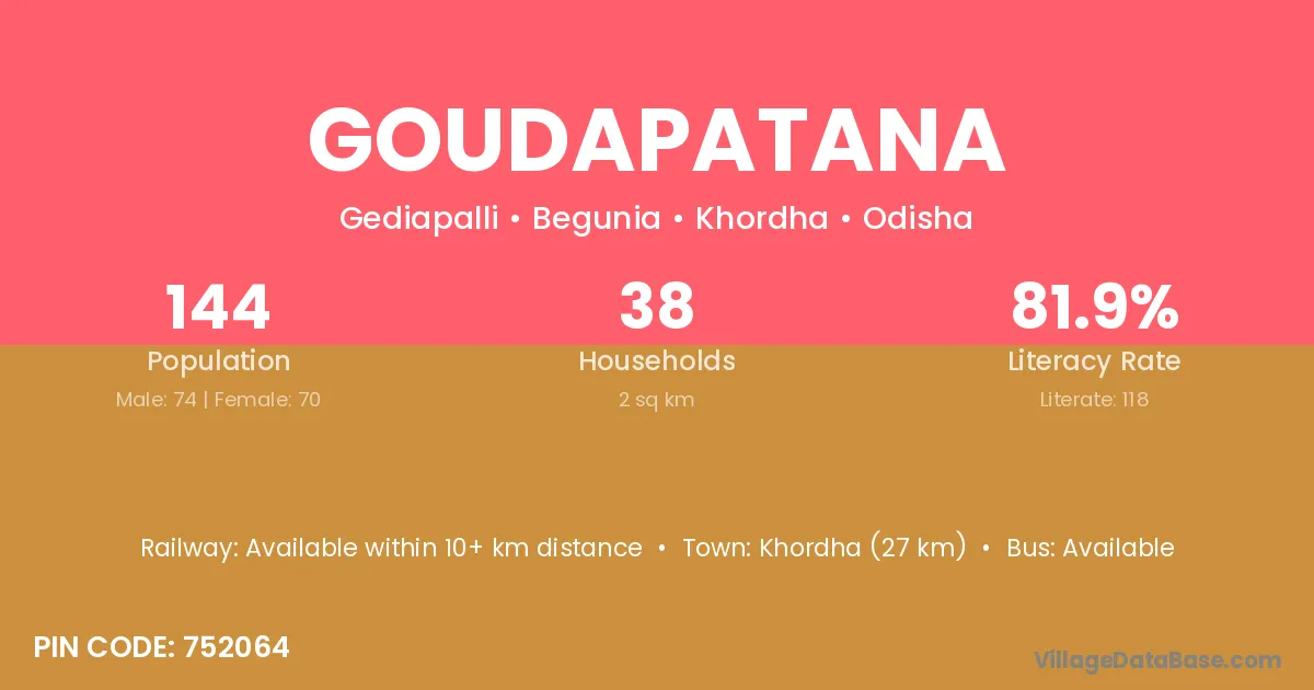 Khordha (27 km) is the nearest town to Goudapatana village for major economic activities and is located approximately 27 km away.