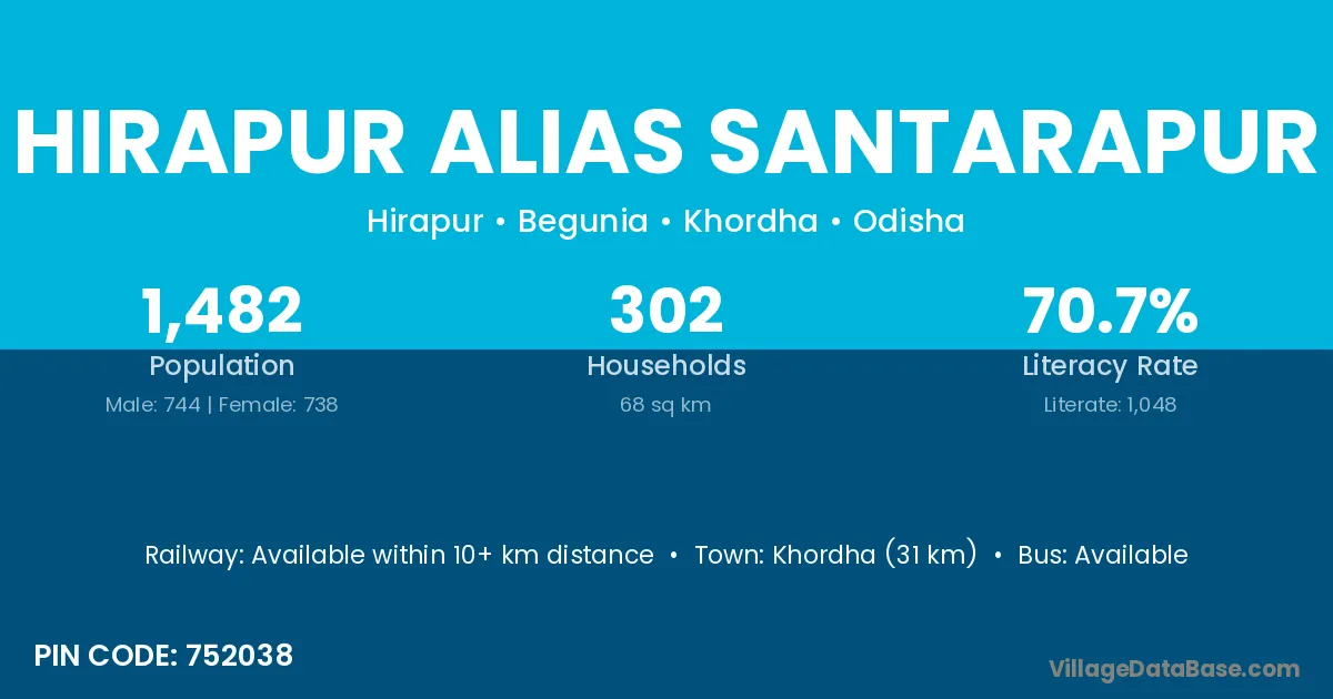 Hirapur Alias Santarapur village has a total population of 1,482 people, of which 744 are males and 738 are females.