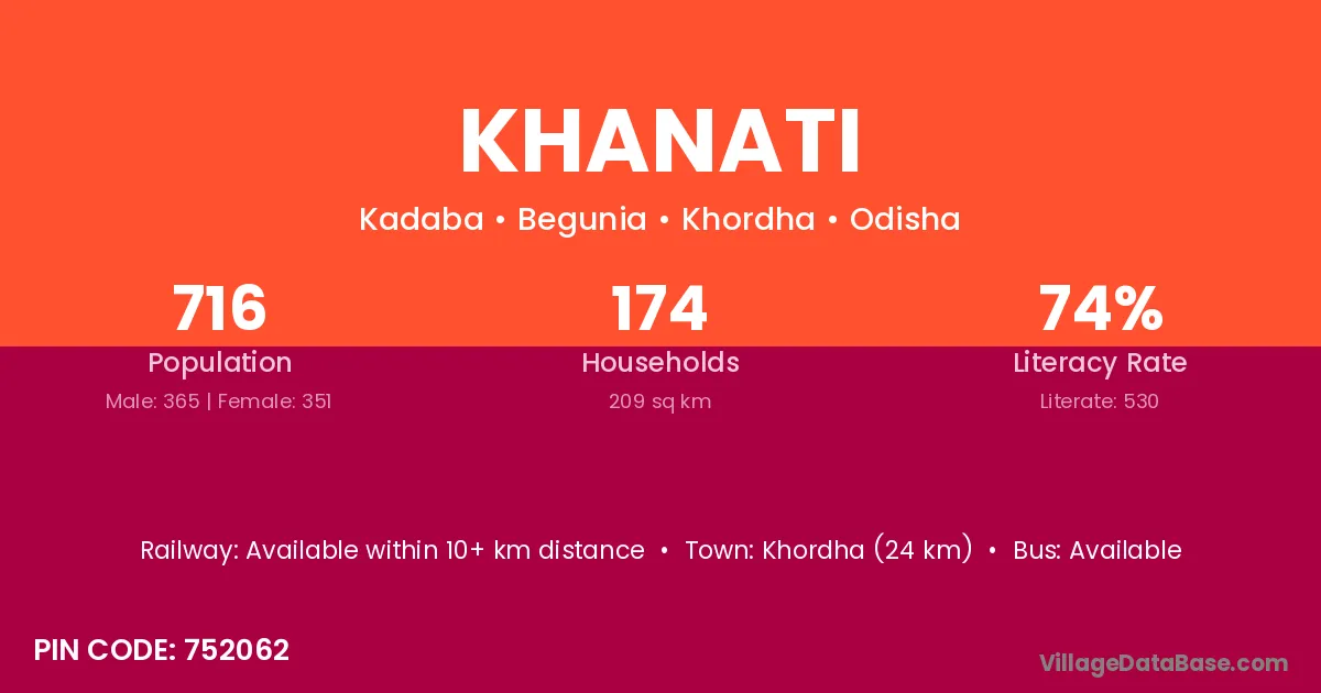 Khordha (24 km) is the nearest town to Khanati village for major economic activities and is located approximately 24 km away.