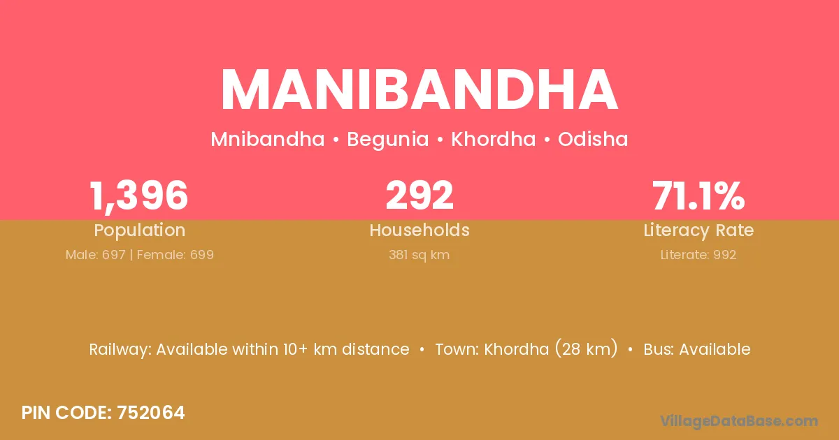 Manibandha village has a total population of 1,396 people, of which 697 are males and 699 are females.