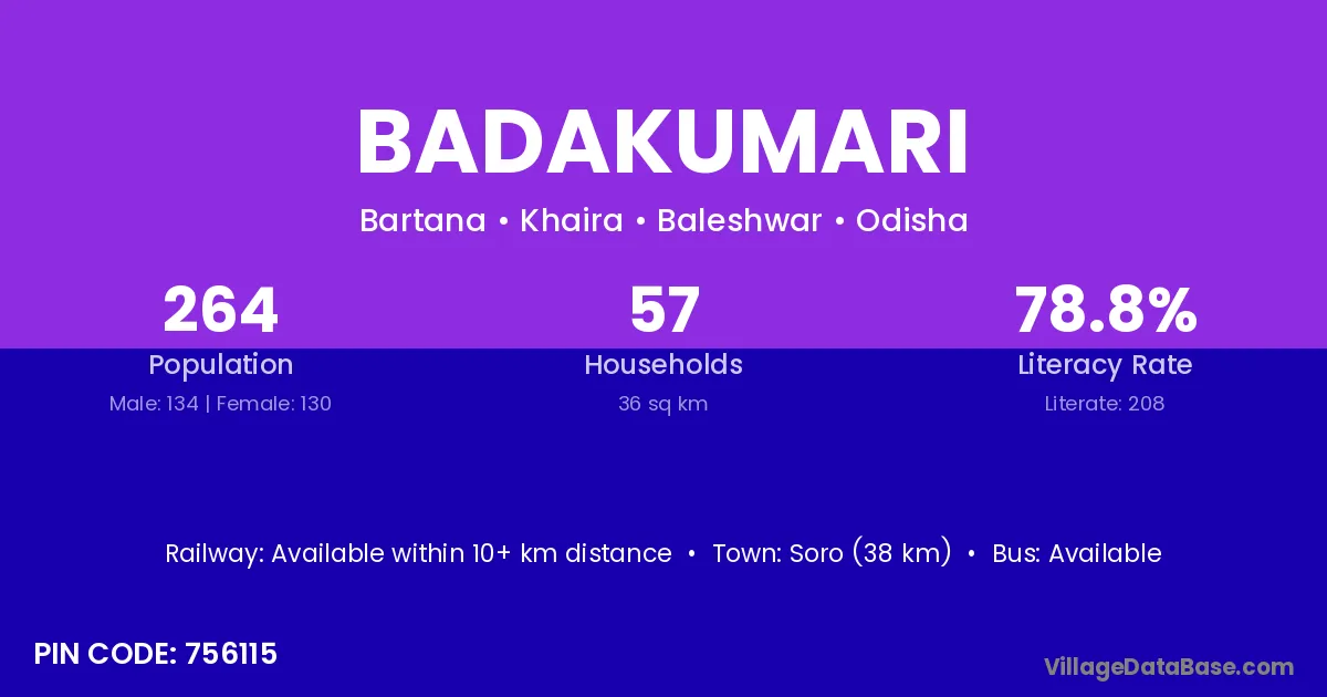 Khordha (34 km) is the nearest town to Badakumari village for major economic activities and is located approximately 34 km away.