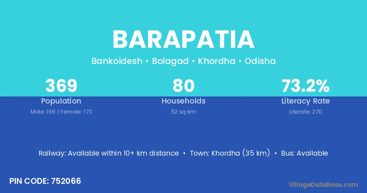 Khordha (35 km) is the nearest town to Barapatia village for major economic activities and is located approximately 35 km away.