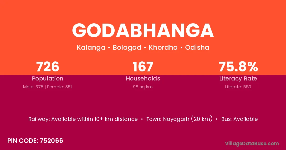 Nayagarh (20 km) is the nearest town to Godabhanga village for major economic activities and is located approximately 20 km away.