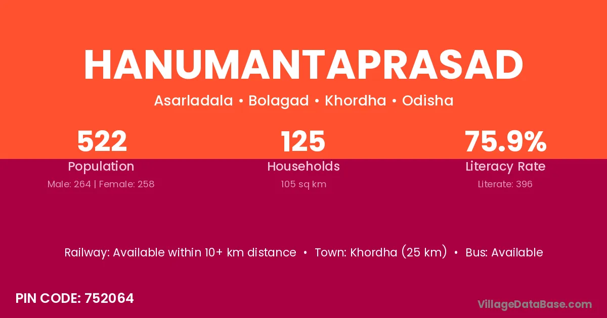 Khordha (25 km) is the nearest town to Hanumantaprasad village for major economic activities and is located approximately 25 km away.