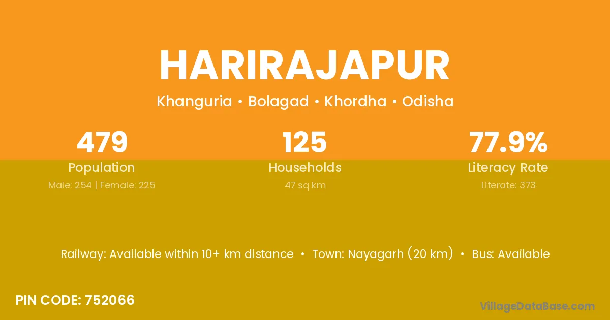 Nayagarh (20 km) is the nearest town to Harirajapur village for major economic activities and is located approximately 20 km away.