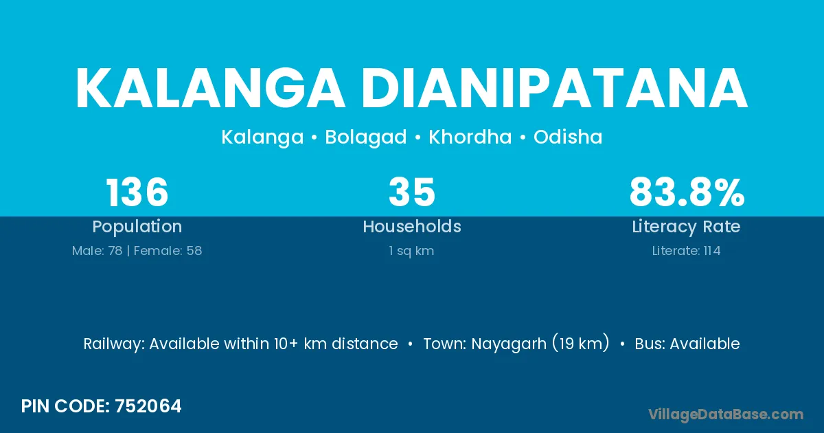 Nayagarh (19 km) is the nearest town to Kalanga Dianipatana village for major economic activities and is located approximately 19 km away.
