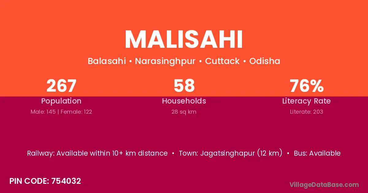 Nayagarh (18 km) is the nearest town to Malisahi village for major economic activities and is located approximately 18 km away.