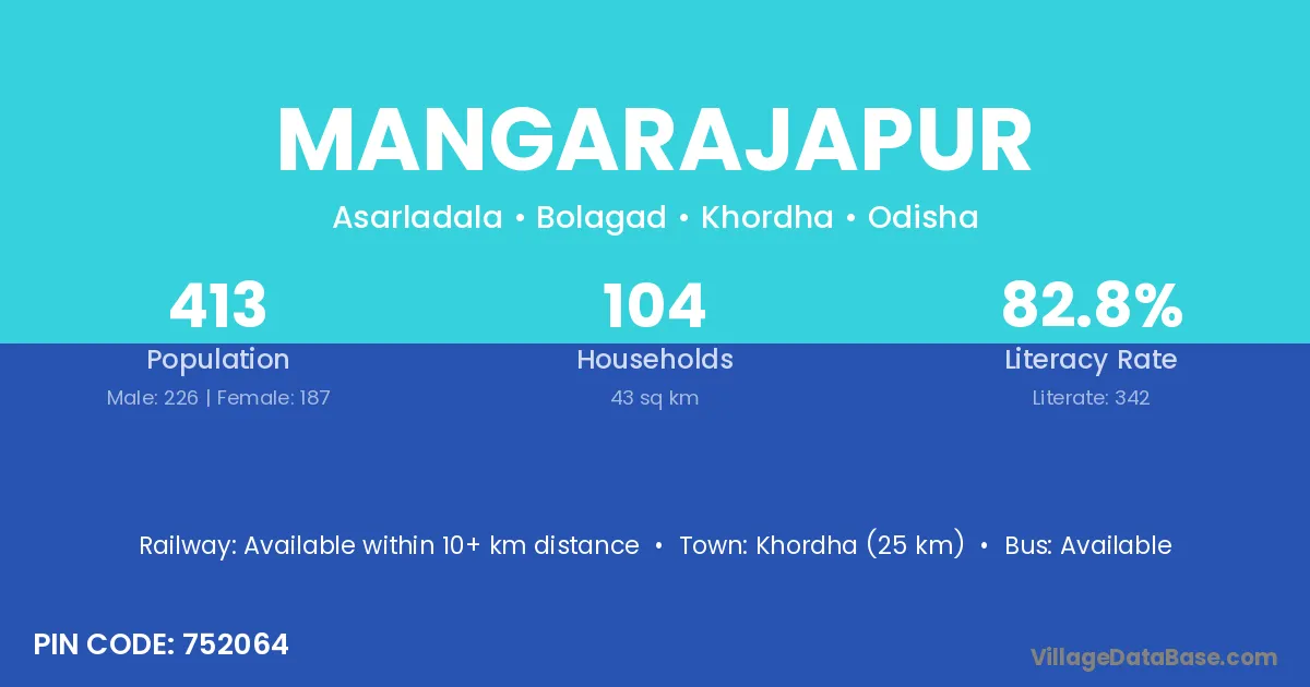Khordha (25 km) is the nearest town to Mangarajapur village for major economic activities and is located approximately 25 km away.