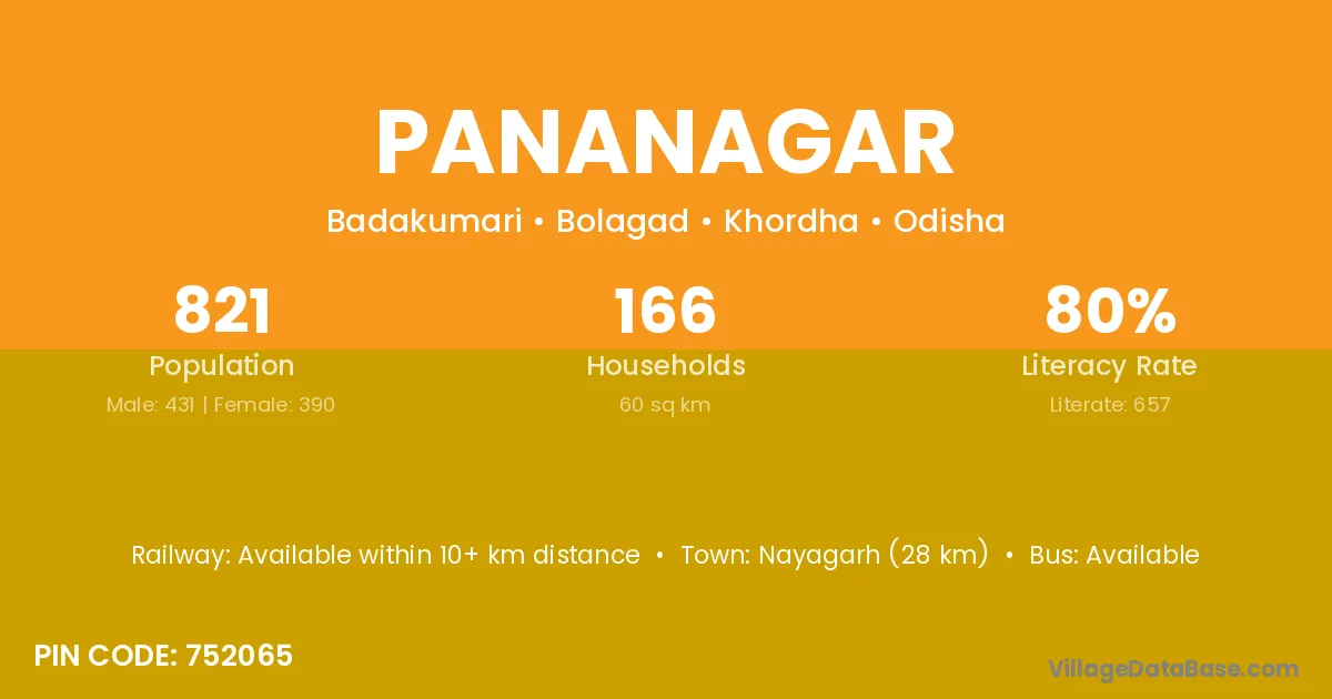 Nayagarh (28 km) is the nearest town to Pananagar village for major economic activities and is located approximately 28 km away.