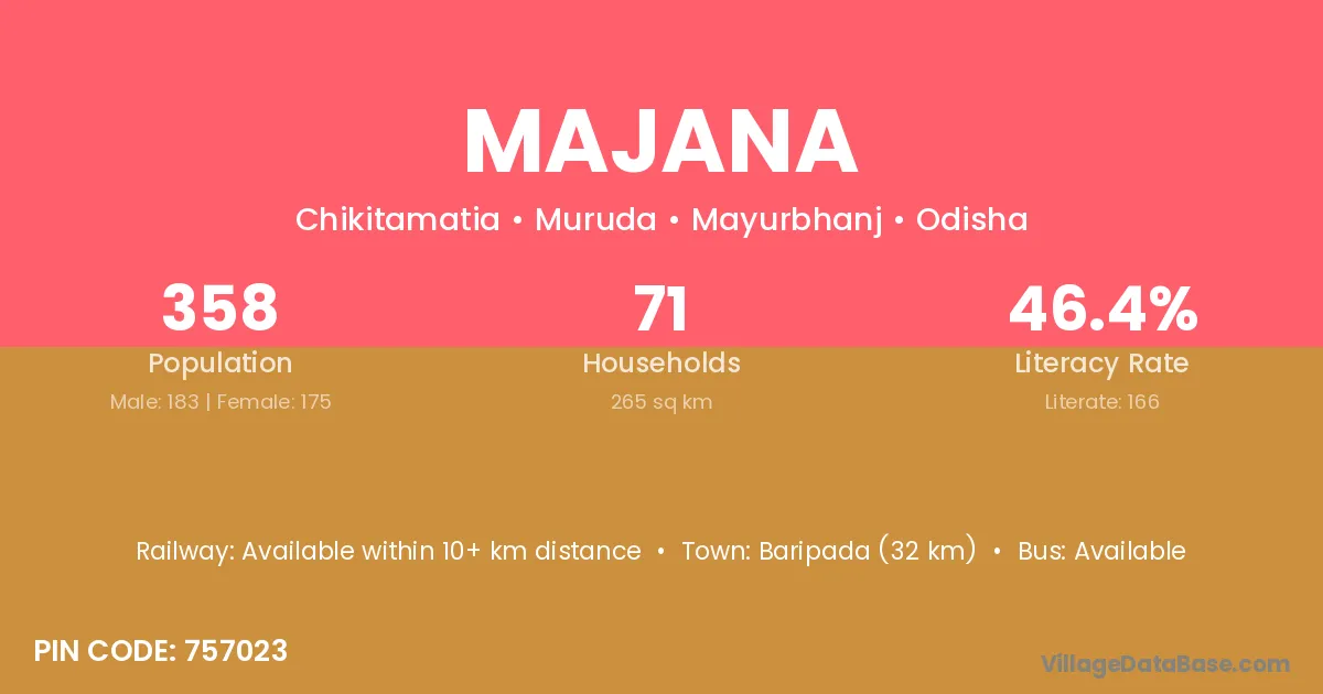 Bhubaneswar (30 km) is the nearest town to Majana village for major economic activities and is located approximately 30 km away.