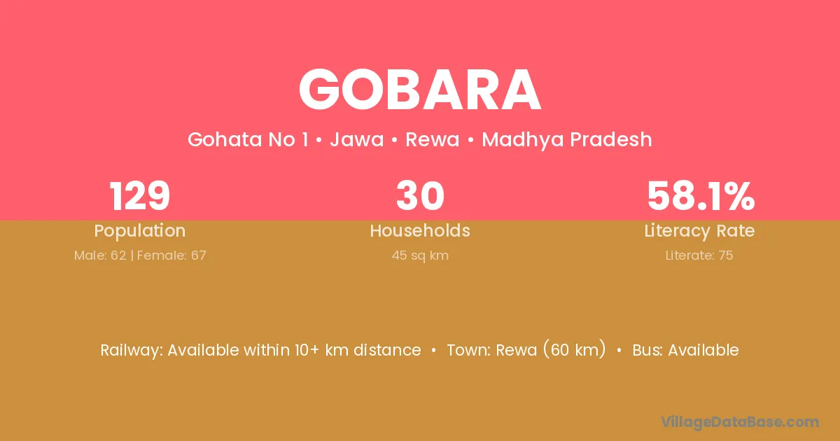 The literacy rate of Gobara village is 72.00%. Male literacy stands at 78.57% and female literacy at 63.64%.