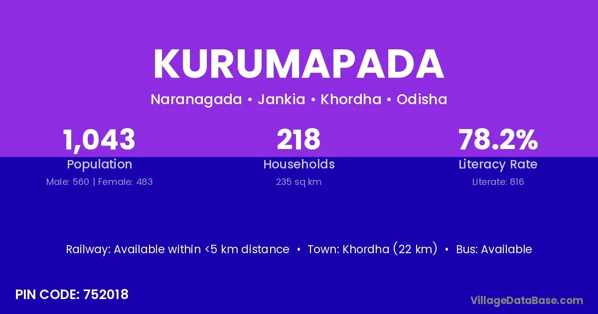 Khordha (22 km) is the nearest town to Kurumapada village for major economic activities and is located approximately 22 km away.