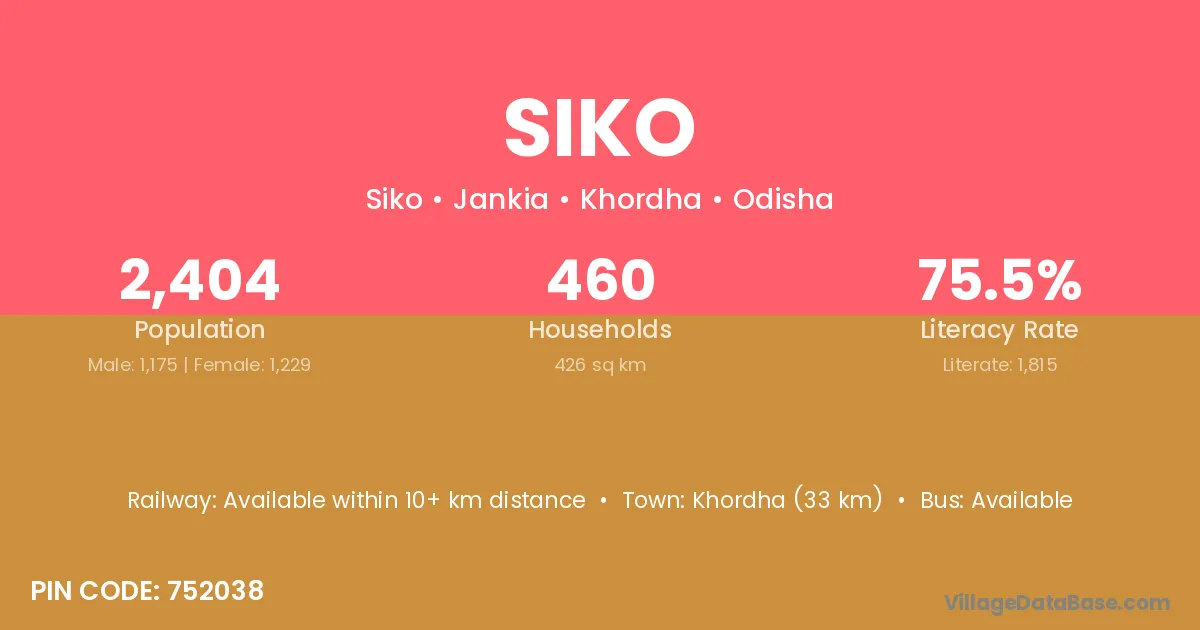 Khordha (33 km) is the nearest town to Siko village for major economic activities and is located approximately 33 km away.