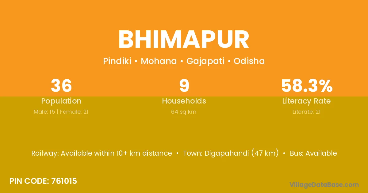 Jatani (5 km) is the nearest town to Bhimapur village for major economic activities and is located approximately 5 km away.