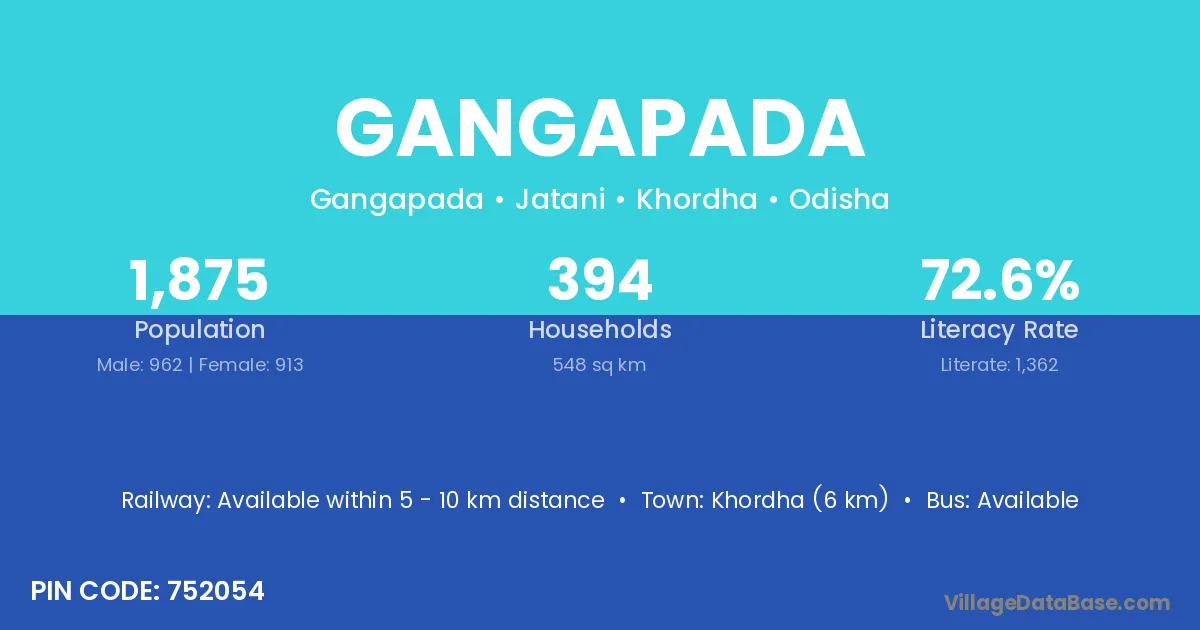 Khordha (6 km) is the nearest town to Gangapada village for major economic activities and is located approximately 6 km away.