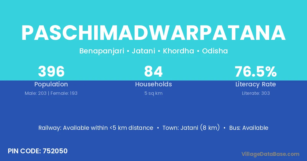 Jatani (8 km) is the nearest town to Paschimadwarpatana village for major economic activities and is located approximately 8 km away.