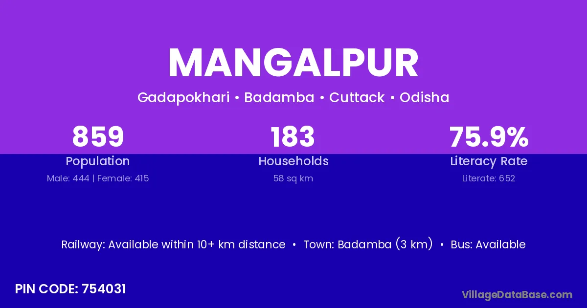 Khordha (9 km) is the nearest town to Mangalpur village for major economic activities and is located approximately 9 km away.