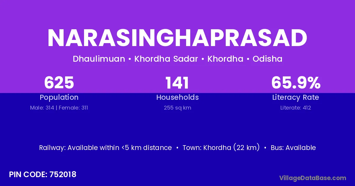 Khordha (22 km) is the nearest town to Narasinghaprasad village for major economic activities and is located approximately 22 km away.
