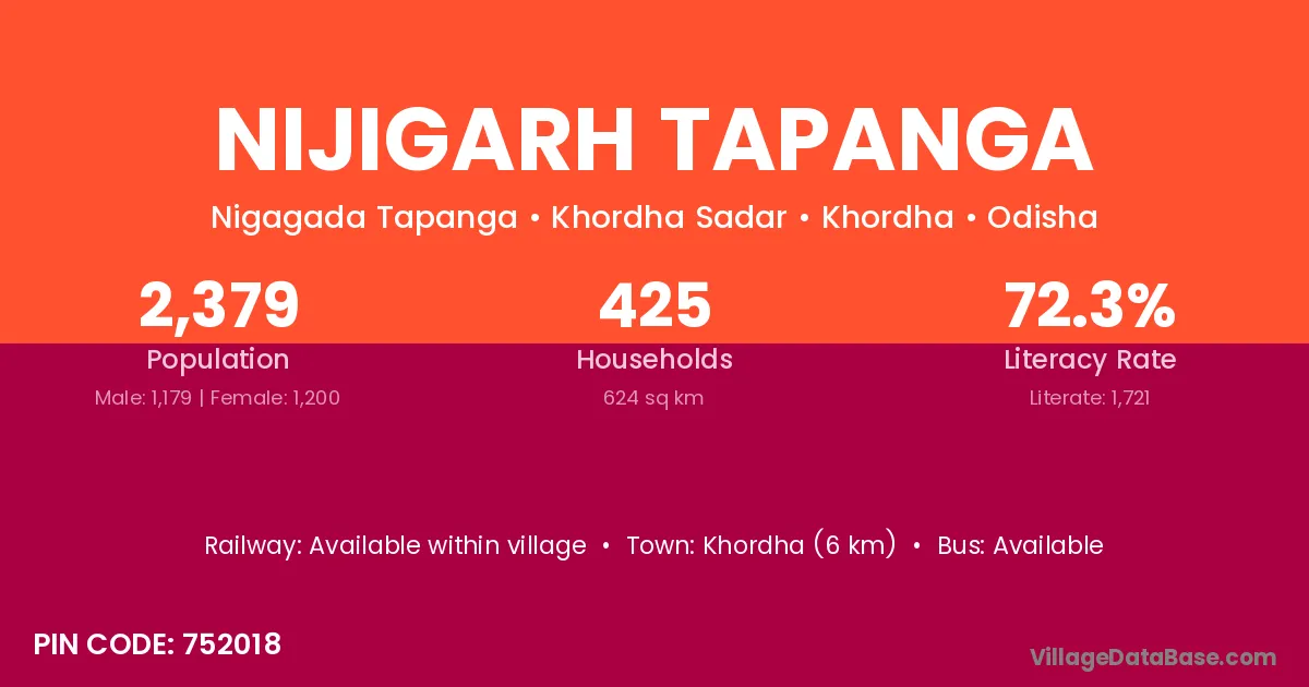 Khordha (6 km) is the nearest town to Nijigarh Tapanga village for major economic activities and is located approximately 6 km away.
