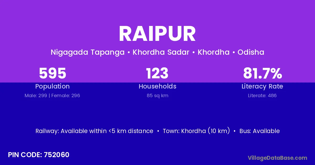 Khordha (10 km) is the nearest town to Raipur village for major economic activities and is located approximately 10 km away.
