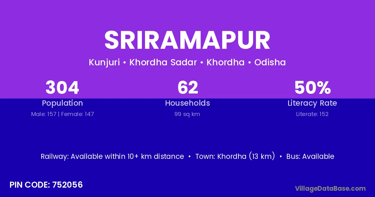 Khordha (13 km) is the nearest town to Sriramapur village for major economic activities and is located approximately 13 km away.