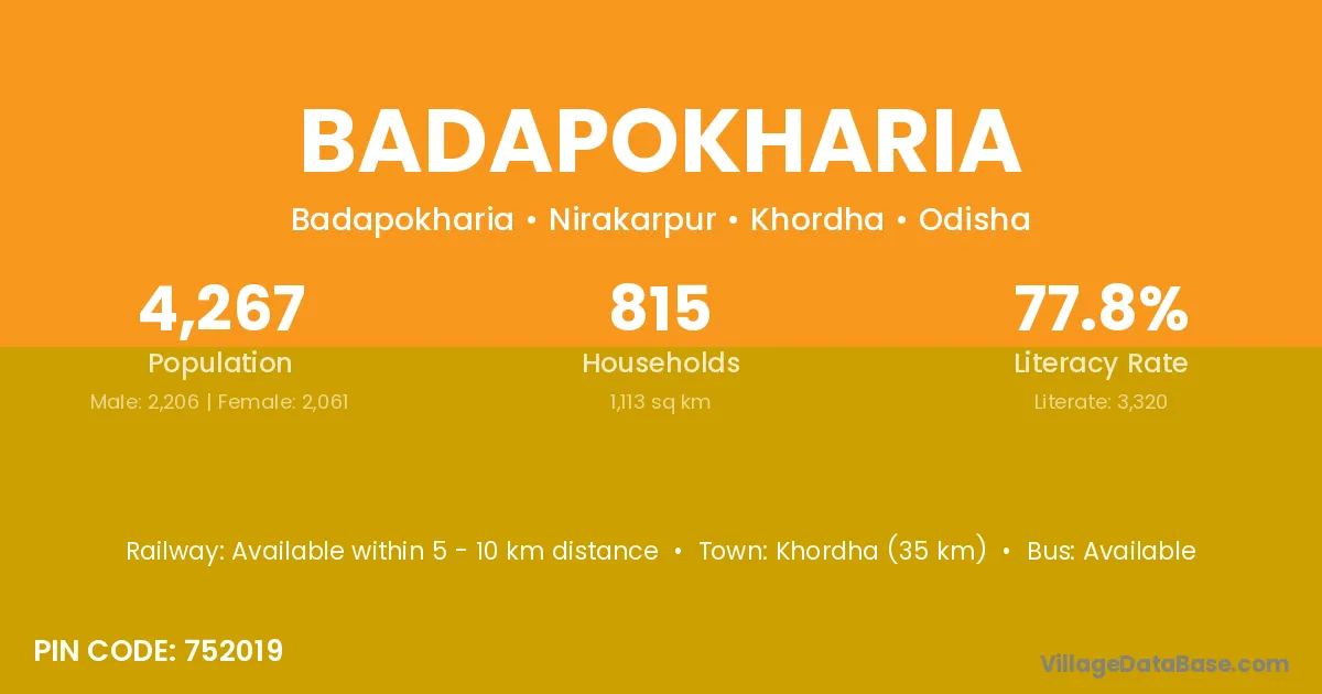 Khordha (35 km) is the nearest town to Badapokharia village for major economic activities and is located approximately 35 km away.