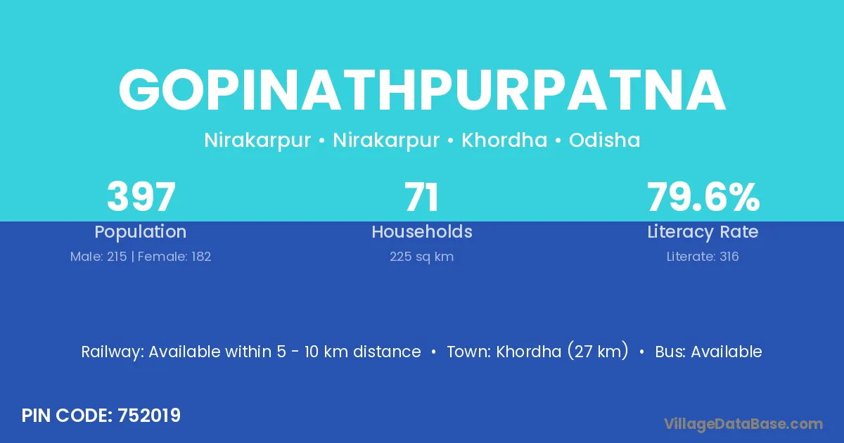 Khordha (27 km) is the nearest town to Gopinathpurpatna village for major economic activities and is located approximately 27 km away.
