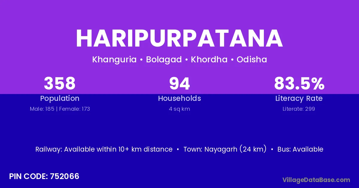Khordha (39 km) is the nearest town to Haripurpatana village for major economic activities and is located approximately 39 km away.
