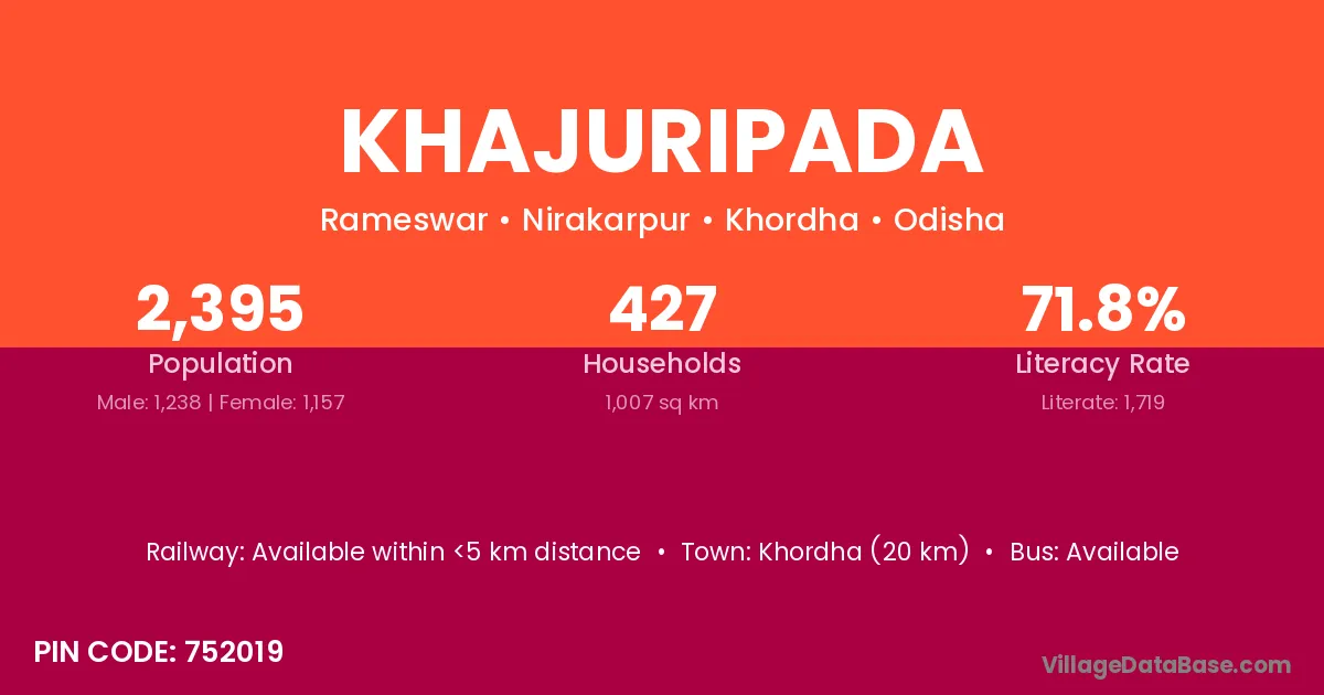 Khordha (20 km) is the nearest town to Khajuripada village for major economic activities and is located approximately 20 km away.