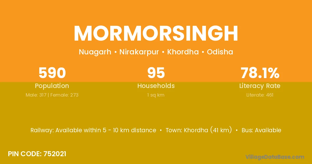 Khordha (41 km) is the nearest town to Mormorsingh village for major economic activities and is located approximately 41 km away.