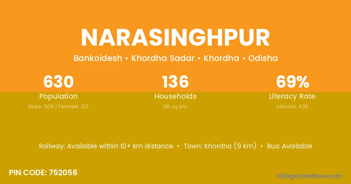 Jatani (13 km) is the nearest town to Narasinghpur village for major economic activities and is located approximately 13 km away.