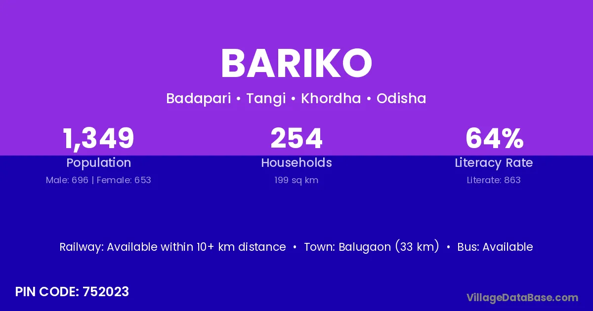 Balugaon (33 km) is the nearest town to Bariko village for major economic activities and is located approximately 33 km away.